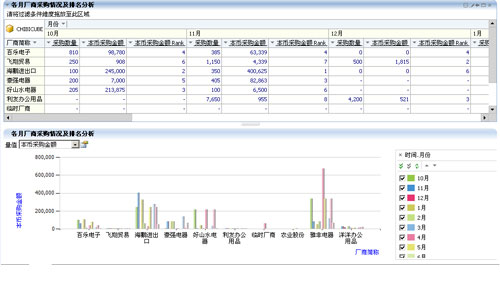 如下圖—各月廠商采購(gòu)情況及排名分析:將要考察的信息(如:采購(gòu)數(shù)量、采購(gòu)金額)納入,并加入廠商維度,形成各廠商采購(gòu)分析情況,透過(guò)“排名”公式,就可以快速實(shí)現(xiàn)廠商的采購(gòu)情況和排名情況分析。